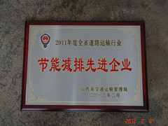 2012年2月8日,在山西省道路運(yùn)輸工作會議上,我公司獲得由山西省交通運(yùn)輸管理局頒發(fā)的2011年度全省道路運(yùn)輸行業(yè)《節(jié)能減排先進(jìn)企業(yè)》榮譽(yù)稱號。