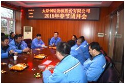 2015年2月19日,公司召開(kāi)春節(jié)團(tuán)拜會(huì)。公司總經(jīng)理胡永生代表董事會(huì)向全體職工及家屬送上誠(chéng)摯的春節(jié)祝福,同時(shí)各部門各分公司經(jīng)理也表達(dá)出對(duì)鋼運(yùn)物流的深切祝福。會(huì)后,總經(jīng)理助理尹躍飛、郝建國(guó)深入現(xiàn)場(chǎng)慰問(wèn)一線職工。