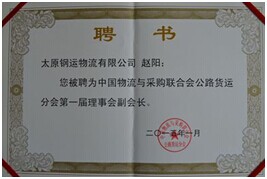 2015年3月5日受中國(guó)物流與采購(gòu)聯(lián)合會(huì)邀請(qǐng),公司總經(jīng)理胡永生赴上海參加中國(guó)物流與采購(gòu)聯(lián)合會(huì)公路貨運(yùn)分會(huì)一屆二次理事會(huì)。我公司被大會(huì)選為“中國(guó)物流與采購(gòu)聯(lián)合會(huì)公路貨運(yùn)分會(huì)副會(huì)長(zhǎng)單位”,公司董事長(zhǎng)趙陽被聘為公路貨運(yùn)分會(huì)****屆理事會(huì)副會(huì)長(zhǎng)。