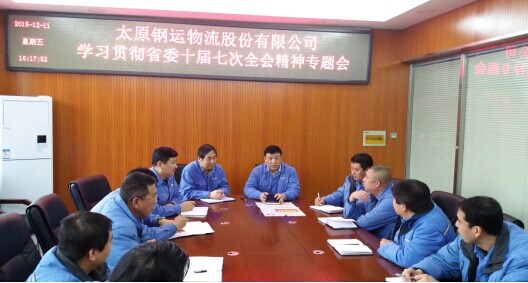 12月11日,按照尖草坪經(jīng)信局黨委的要求,公司黨委召開各分公司和各部室負責(zé)人專題會議,傳達學(xué)習(xí)貫徹省委十屆七次全會精神。會議傳達了《中共山西省委關(guān)于制定國民經(jīng)濟和社會發(fā)展第十三個五年規(guī)劃的建議》、省委書記王儒林同志的重要講話精神以及對《“十三五”規(guī)劃建議》的說明。 公司要求把學(xué)習(xí)貫徹省委十屆七次全會精神作為當(dāng)前一項重要政治任務(wù),與學(xué)習(xí)貫徹十八屆五中全會精神結(jié)合起來,與學(xué)習(xí)貫徹習(xí)近平總書記系列重要講話精神結(jié)合起來,與“三嚴三實”專題教育結(jié)合起來,精心組織實施,迅速掀起學(xué)習(xí)宣傳貫徹的熱潮,要認清形勢、搶抓機遇,知難而進,進一步明晰鋼運物流發(fā)展思路,加快企業(yè)發(fā)展步伐。